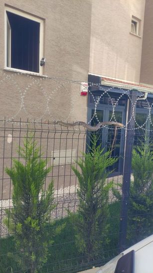 Bursa'nın Nilüfer ilçesi Kurtuluş Mahallesindeki bir sitenin bahçe tellerine sarılı halde görülen yılan korku dolu anlar yaşattı.