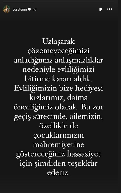 Boşanma döneminde açıklama yapan Buse Terim; "Uzlaşarak çözemeyeceğimizi anladığımız anlaşmazlıklar nedeniyle evliliğimizi bitirme kararı aldık. Evliliğimizin bize hediyesi kızlarımız, daima önceliğimiz olacak. Bu zor geçiş sürecinde, ailemizin, özellikle de çocuklarımızın mahremiyetine göstereeğiniz hassasiyet için şimdiden teşekkür ederiz" dedi.