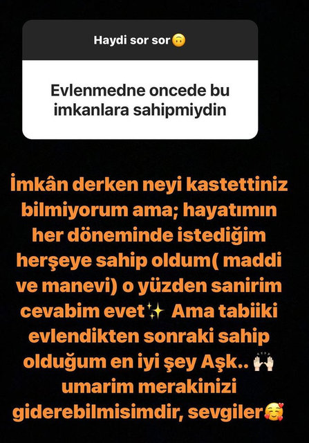 'İmkan' derken neyi kastettiniz bilmiyorum ama hayatımın her döneminde istediğim her şeye sahip oldum. (Maddi ve manevi...) O yüzden sanırım cevabım; evet ama tabii ki evlendikten sonraki sahip olduğum en iyi şey; aşk... Umarım merakınızı giderebilmişimdir, sevgiler...