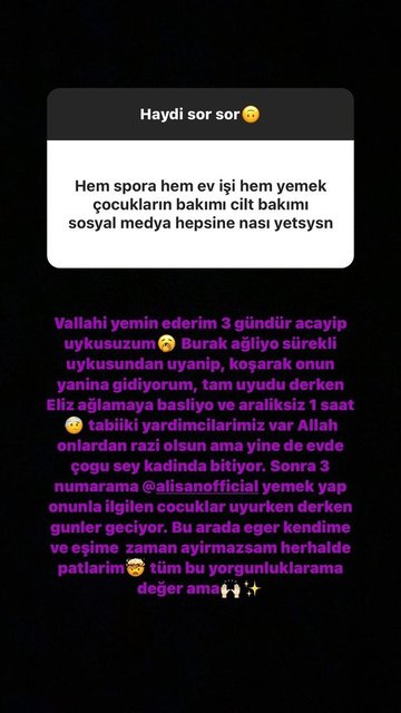 Tabii ki yardımcılarımız var, Allah onlardan razı olsun ama yine de evde çoğu şey kadında bitiyor. Sonra 3 numaram Alişan'a... Yemek yap, onunla ilgilen, çocuklar uyurken derken günler geçiyor. Bu arada eğer kendime ve eşime zaman ayırmazsam herhalde patlarım. Tüm bu yorgunluklarıma değer ama...