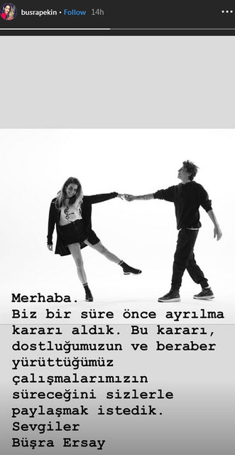 Pekin, sosyal medya hesabından, "Merhaba... Biz bir süre önce ayrılma kararı aldık. Bu kararı dostluğumuzun ve beraber yürüttüğümüz çalışmalarımızın süreceğini sizlerle paylaşmak istedik. Sevgiler Büşra-Ersay... " açıklamasını yaptı.