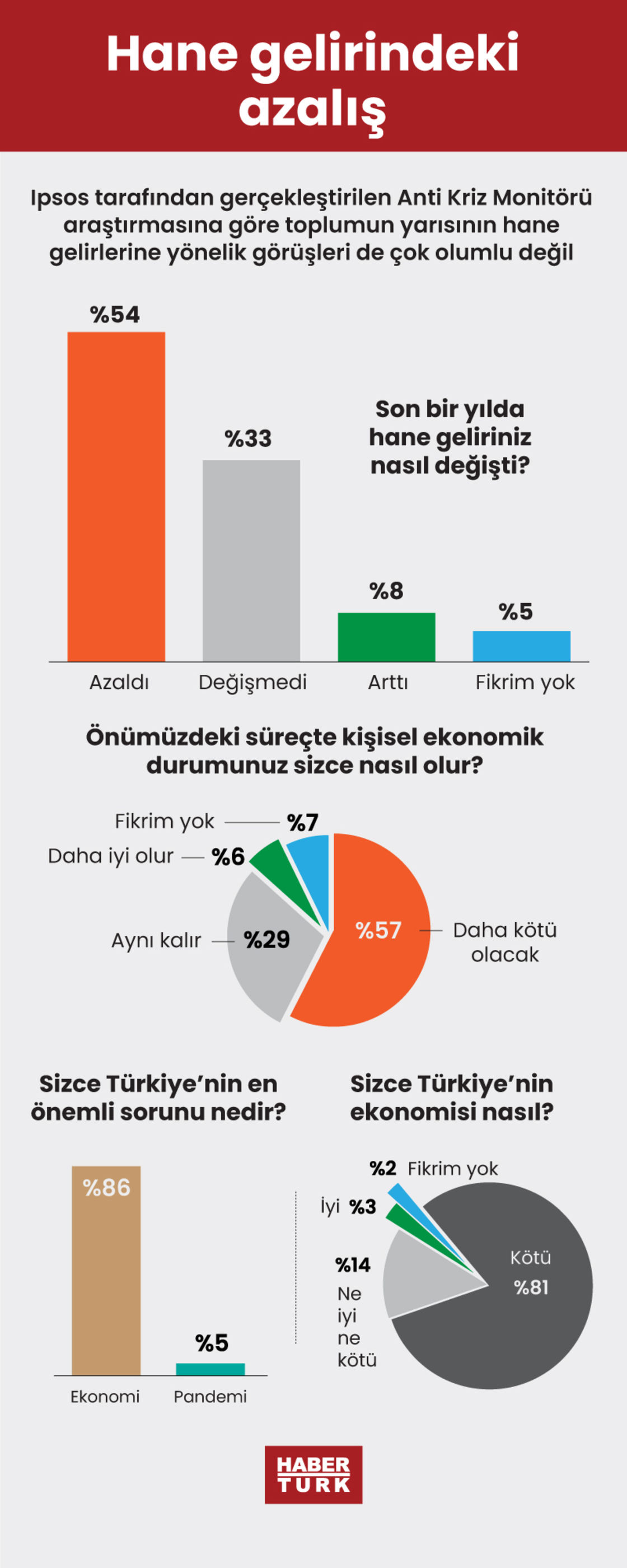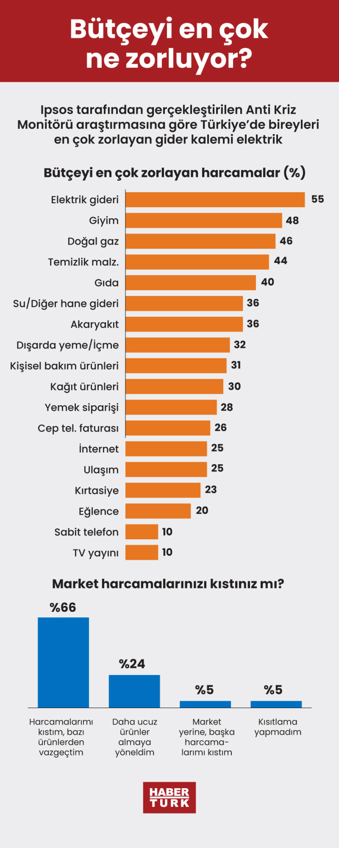 Ipsos tarafından gerçekleştirilen Anti Kriz Monitörü araştırmasına göre Türkiye'de bireyleri en çok zorlayan gider kalemi elektrik. Toplumun yarısının hane gelirlerine yönelik görüşleri de çok olumlu değil