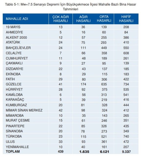 Rapora göre Mw=7.5 büyüklüğündeki senaryo depreminde, Büyükçekmece’deki binaların ortalama yüzde 42’sinin hasar görmeyeceği tahmin edilmektedir. Binaların ortalama yüzde 30’unun hafif, yüzde 21’ünün orta, yüzde 5’inin ağır ve yüzde 2 ’sinin de çok ağır hasar görmesi beklenmektedir. Büyükçekmece’de, analiz edilen toplam bina sayısı 31.343’tür. Ağır ve çok ağır hasarlı binaların aldıkları deprem hasarının, onarılamayacak boyutta olabileceği ve bu hasar seviyelerindeki binaların yıkılıp tekrar yapılması gereğinin ortaya çıkacağı öngörülmektedir.
