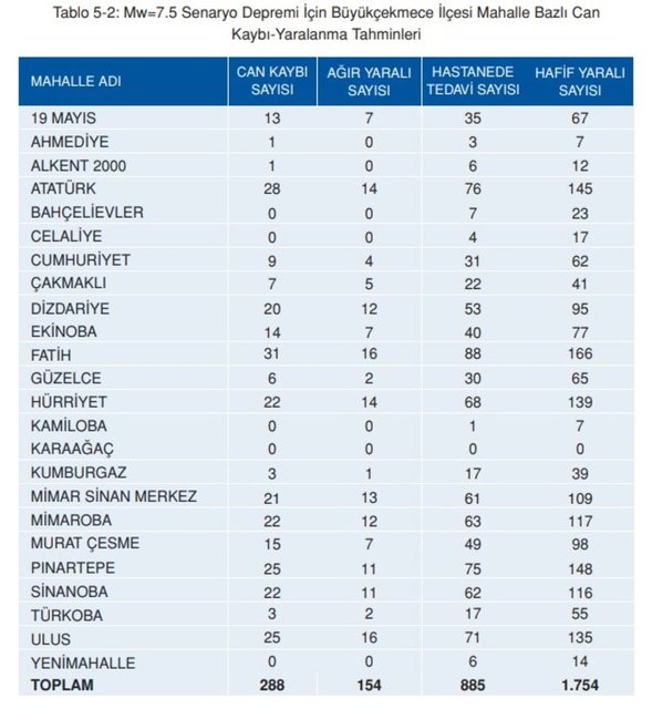 Mw=7.5 büyüklüğündeki senaryo depreminin, en kötü senaryo olan gece meydana gelmesi halinde, Büyükçekmece’de ortalama 288 civarında can kaybı meydana gelebileceği, yaklaşık 154 kişinin ağır yaralanabileceği ve 885 kişinin de hastane şartlarında tedavi görmesi gerekebileceği öngörülmektedir.