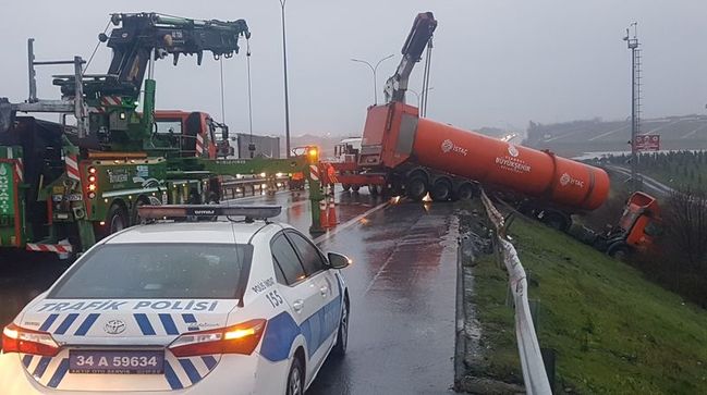 Kaza TEM Büyükçekmece mevkii'nde saat 17.30 sıralarında meydana geldi. 2 TIR ve bir kamyonet kazaya karıştı. İstanbul Büyükşehir Belediyesi'ne ait katı atık TIR'ı bariyeri aşarak yol kenarına düştü. Olay yerine sağlık ve itfaiye ekibi sevk edildi.