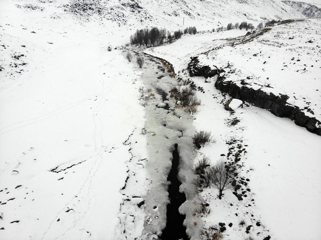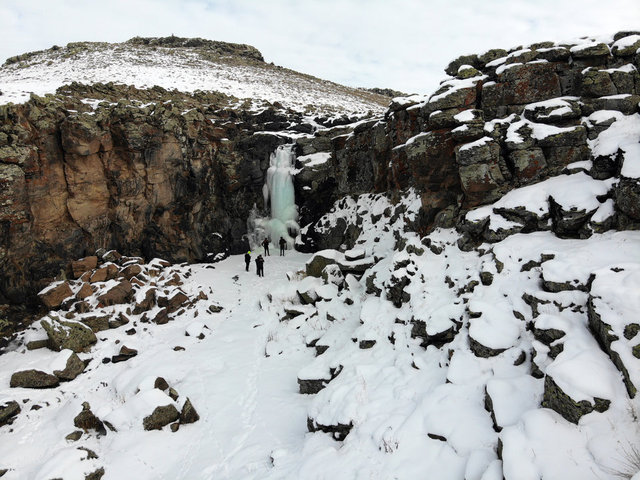 Buz tutan Aşağı Toklu Şelalesi drone ile görüntülendi