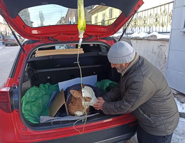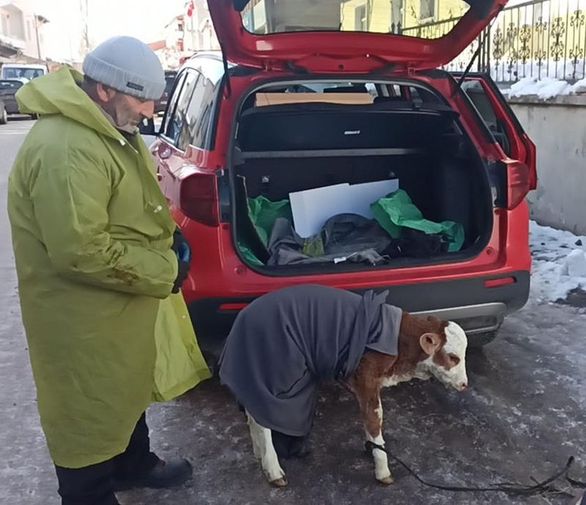 Ardahan'ın Posof'a bağlı Türkgözü köyünde yaşayan Savaş Atalay, 5 günlük buzağısı annesini emmeyi kesince otomobilinin bagajına koyarak ilçe merkezindeki veterinere götürdü.