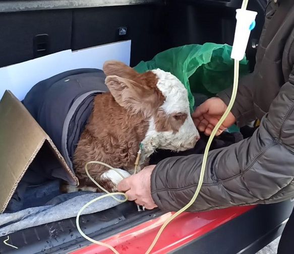 Ardahan'ın Posof ilçesinde rahatsızlanınca sahibi tarafından veterinere getirilen 5 günlük buzağıya otomobilin bagajında serum tedavisi uygulandı. Serumun ardından ayağa kalkan buzağı, sahibini sevindirdi
