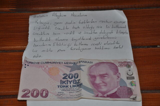 İkindi namazını kıldırmak için ibadethaneye giden imam hatip Halil Erdem, "Yolcuyuz, feribot saatini beklerken mecburen camiye sığındık. Çocuğumuz hasta olduğu için prizi kullanarak hava verdik, sıcaktan dolayı da klimaları kullandık. Kullanım ücreti olarak bir miktar para bırakıyorum. Hakkınızı helal edin." yazılı notu fark etti.