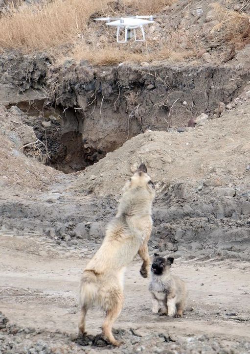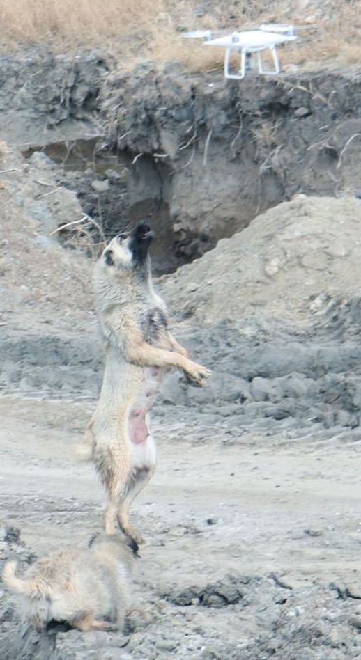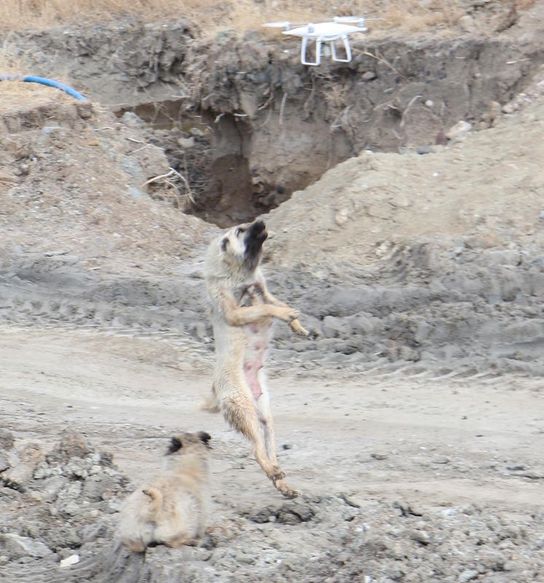 Iğdır'ın Tuzluca ilçesindeki tuz işletmesinde bulunan 'Çamur' adlı köpek, bölgede çekim yapan gazetecilerin kullandığı drone'dan yavrusunu korumak için havaya sıçradı. O anlar, kameraya yansıdı