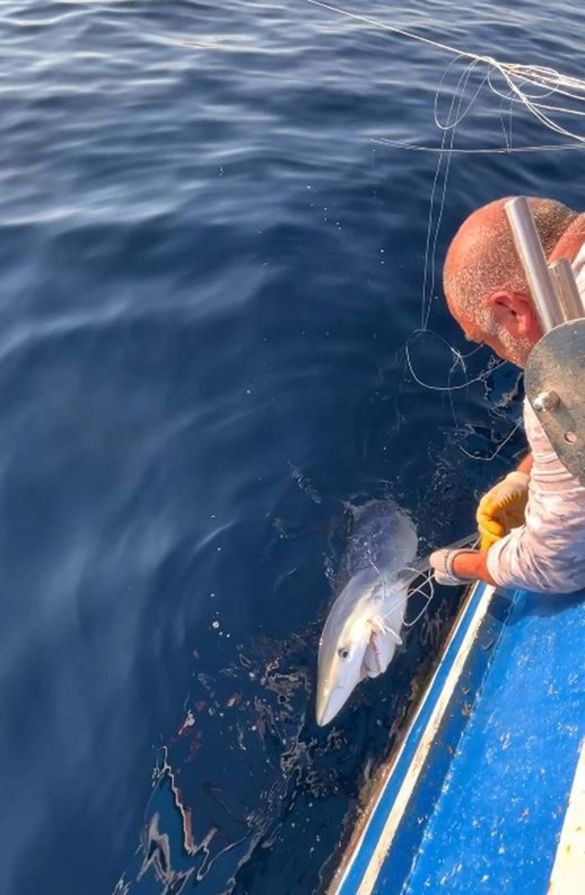 Parakete takımını çeken Özdemir, denizin içinde dev bir balık olduğunu gördü. Yüzeye yaklaşan balığın mavi köpek balığı olduğunu fark eden balıkçılar şaşkınlık yaşadı.