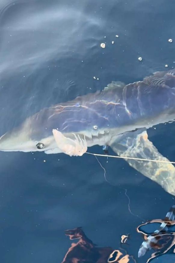 Yüzeye yaklaştıktan sonra Özdemir oltayı koparıp, yaklaşık 100 kilogram ağırlığında ve 2,5 metre boyundaki mavi köpek balığını doğal ortamına bıraktı. Özdemir ve arkadaşları o anları cep telefonu kamerasıyla kaydetti.