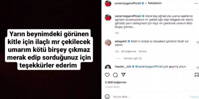 Togar, paylaşımına "Gece baş ağrılarıyla uyanıp saatlerce agridan duramıyordum MR çekildi, ağrı olan bölgede bir sıkıntı görüldü. Yarın netleşmesi için ilaçlı MR çekilecek umarım kötü birşey çıkmaz..'' notunu düştü.