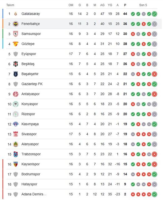 Süper Lig güncel puan durumu... Galatasaray ligin 17. haftasında Kayserispor'un konuk oldu. Galatasaray Kayserispor'u 5-1'lik skorla mağlup ederek liderliğini sürdürdü. Maçta son düdük sesinin gelmesinin ardından Süper Lig puan durumu gündemdeki yerini aldı. İşte Süper Lig puan durumu ve maç sonuçları...