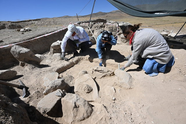 Van'da Urartular döneminde inşa edilen Çavuştepe Kalesi'nin kuzeyindeki nekropol alanında çenesinde bronz gem olan at iskeleti ortaya çıkarıldı