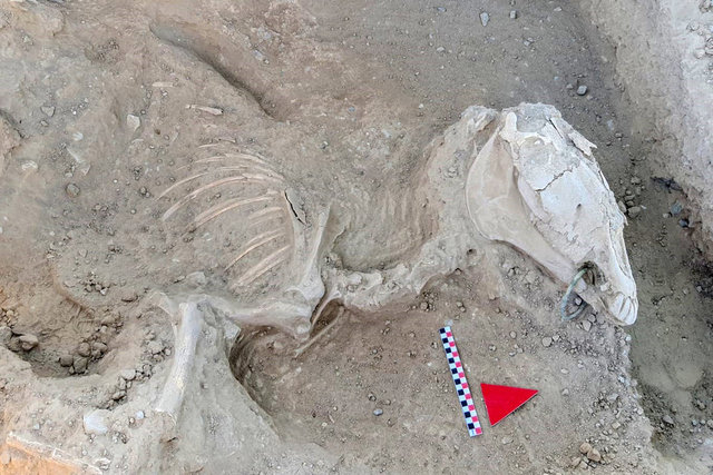 Geçen yıl Urartu yönetici sınıfına ait olduğu değerlendirilen iskeletin ortaya çıkarıldığı noktada, bu sene de çenesinde bronz gem (binek hayvanını yönlendirmek için ağzının içine takılan metal parça) olan at iskeleti bulundu.