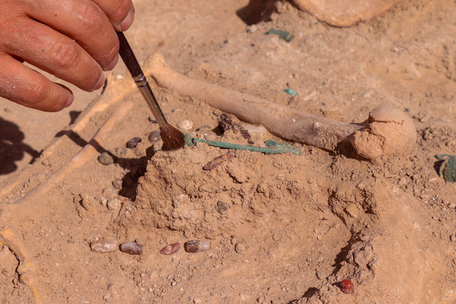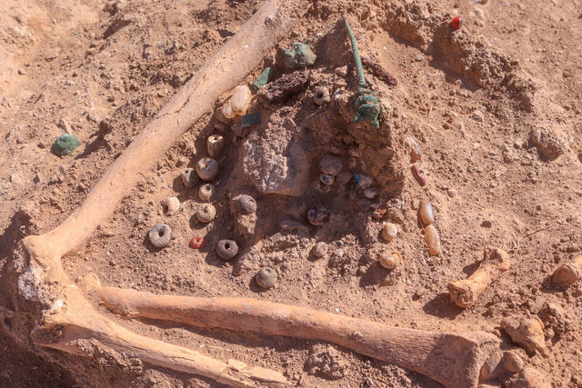 Takılarıyla birlikte gömüldüğünü gördük. Etrafını açtığımızda iskeletin başının olmadığını fark ettik. Başının olmaması dini bir inancın gereği ya da bir ritüelin bir parçası olabilir. Kadının başının daha kutsal bir yere konulmuş olabileceğini tahmin ediyoruz" dedi.