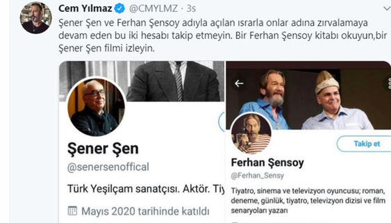 Yılmaz, sahte hesapları sosyal medyada ifşa edip "Şener Şen ve Ferhan Şensoy adıyla açılan ısrarla onlar adına zırvalamaya devam eden bu iki hesabı takip etmeyin. Bir Ferhan Şensoy kitabı okuyun, bir Şener Şen filmi izleyin" yazdı.