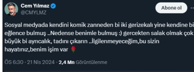 Son günlerde eski sevgilisi Serenay Sarıkaya'ya sosyal medya üzerinden göndermeler yaptığı iddia edilen Cem Yılmaz, kendisine yönelik eleştirilere sert yanıt verdi