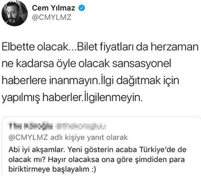 Şimdilerde dikkatini 'Karakomik Filmler' projesine veren komedyen Cem Yılmaz, film dışında bir sosyal medya paylaşımı ile gündeme geldi. Başarılı komedyen, "Yeni gösterin Türkiye'de de olacak mı?" sorusuna, "Elbette olacak. Bilet fiyatları da her zaman ne kadarsa öyle olacak. Sansasyonel haberlere inanmayın" yanıtını verdi