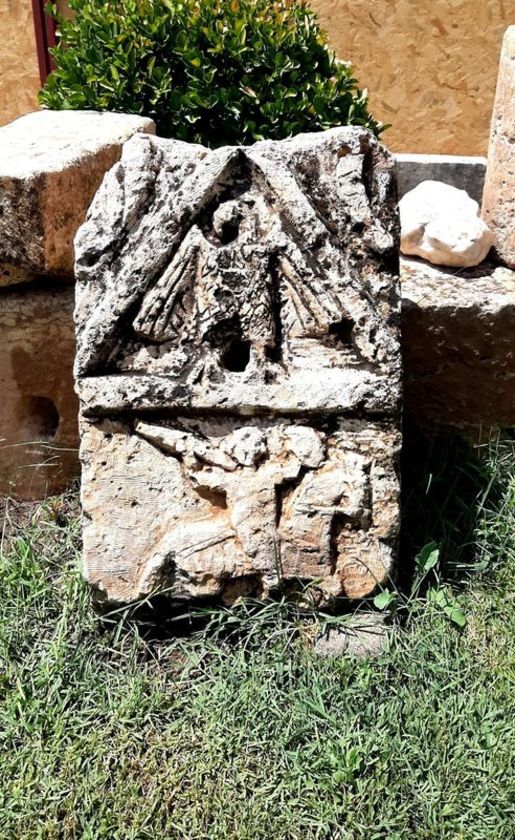 10 yıldan beri müze bahçesinde sergilenen kireçtaşından yapılan kabartmada üçgen içerisinde kanatlarını açmış kartal betimi, gövdesi cepheden başı profilden verilmiş şekilde.