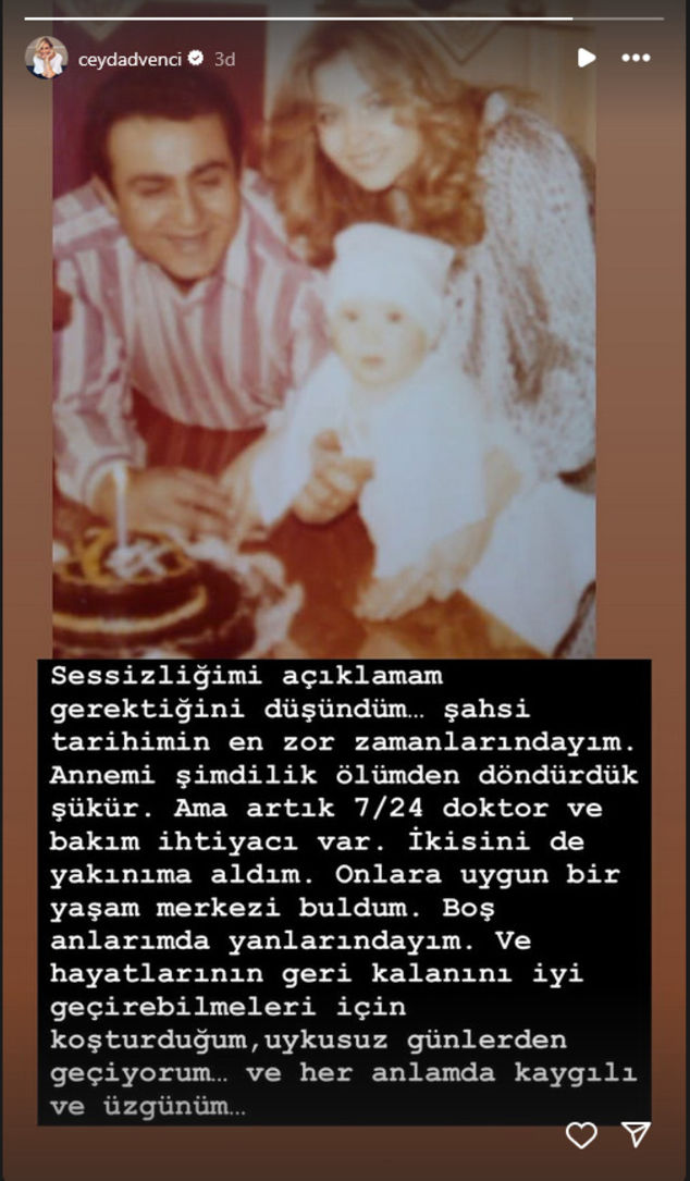 Ceyda Düvenci, şu açıklamayı yaptı: Sessizliğimi açıklamam gerektiğini düşündüm. Şahsi tarihimin en zor zamanlarındayım. Annemi şimdilik ölümden döndürdük şükür. Ama artık 7/24 doktor ve bakım ihtiyacı var. İkisini de yakınıma aldım. Onlara uygun bir yaşam merkezi buldum. Boş anlarımda yanlarındayım. Ve hayatlarının geri kalanını iyi geçirebilmeleri için koşturduğum, uykusuz günlerden geçiyorum. Ve her anlamda kaygılı ve üzgünüm...