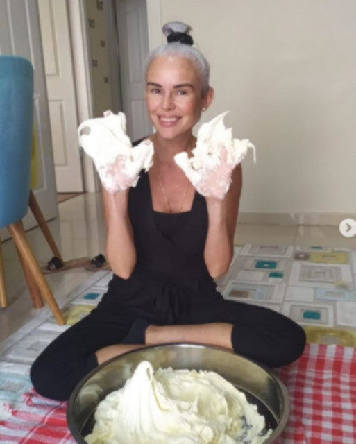 Eski Türkiye güzeli ve sunucu Defne Samyeli, karantina sürecinde helva yaptı.