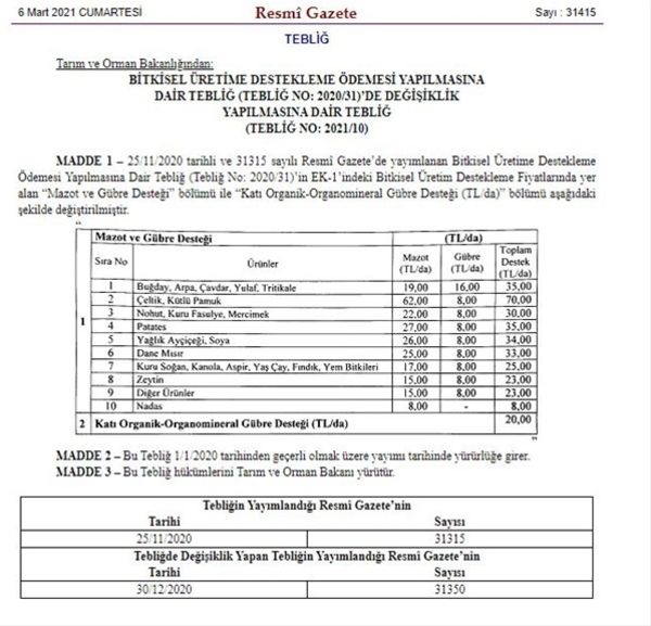 6 MART 2021 TARİHLİ RESMİ GAZETE'DE YAYIMLANAN YENİ MAZOT, GÜBRE DESTEĞİ FİYATLARI