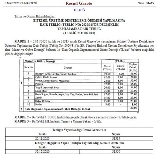 6 MART 2021 TARİHLİ RESMİ GAZETE'DE YAYIMLANAN YENİ MAZOT, GÜBRE DESTEĞİ FİYATLARI