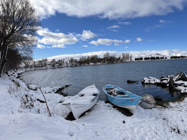 AA'nın haberine göre kardan dolayı, yılın her mevsimi doğal güzelliği ile yerli ve yabancı turistlerin beğenisini toplayan Çıldır ilçesindeki Çıldır Gölü çevresi de tamamen beyaz örtüyle kaplandı.