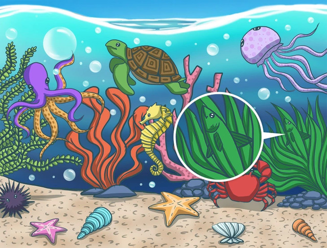 Cevap: En sağda yeşil alglerin arasına gizlenmiş bir balık bulunuyor.