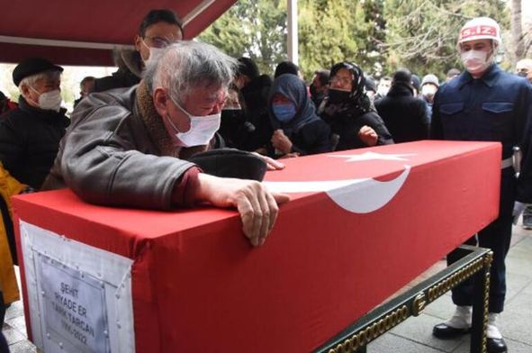 Anne Tarcan da şehit oğlunun tabutuna sarılıp, "Yavrum benim. Ah yavrum benim, nasıl bıraktın bizi?" diyerek gözyaşı döktü.