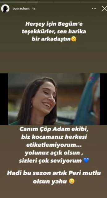 Büşra Çam Instagram hesabında yaptığı paylaşımda şu ifadeleri kullandı: "Her şey için Begüm'e teşekkürler, sen harika bir arkadaştın. Canım Çöp Adam ekibi, biz kocamanız herkesi etiketlemiyorum. Yolunuz açık olsun, sizleri çok seviyorum. Hadi bu sezon artık Peri mutlu olsun yahu"