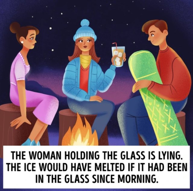 Adam snowboard yapmaktan dönmüştü. Ancak arkadaşlarıyla tekrar bir araya geldiğinde eşyalarını kontrol etti ve yemeğinin eksik olduğunu fark etti ve arkadaşlarına bu konuda bir şey bilip bilmediklerini sordu. İlk kadın bütün gün paten yaptığını, diğeri ise sabahtan beri ateşin yanında aynı meyve suyunu içtiğini söyledi. Adam içlerinden birinin yalan söylediğini anladığı için hemen gülümsedi. Hangisi yalan söylüyordu?