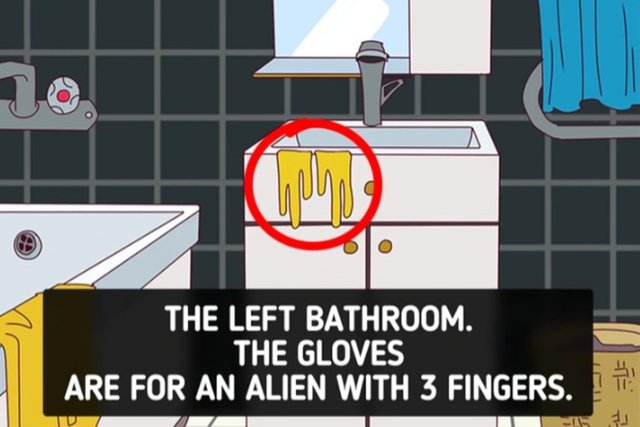 Uzaylı soldaki banyoda yaşıyor çünkü lavaboya bırakılan eldivenlerin farklı ölçülere sahip üç parmağı var.