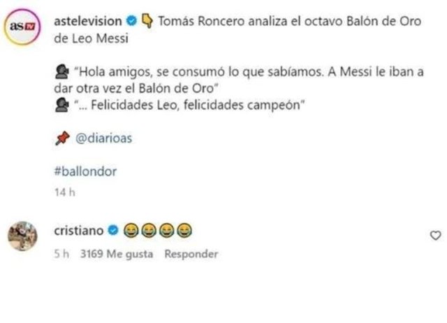 Lionel Messi'nin Ballon d'Or'u 8. kez kazanmasına Cristiano Ronaldo'dan flaş bir tepki geldi. Bu yıl ödül için adaylar arasında yer almayan Portekizli yıldız, sosyal medyada Arjantinli futbolcu hakkındaki eleştiri dolu bir yorumu beğenip ilginç bir yanıt verdi.