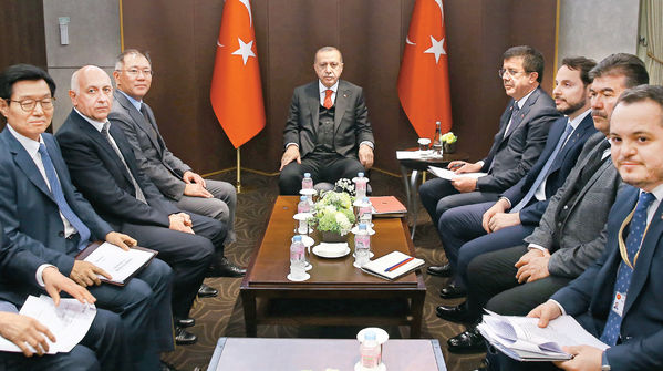 Cumhurbaşkanı Recep Tayyip Erdoğan, resmi ziyaretleri kapsamında geldiği Güney Kore’nin başkenti Seul’de Hyundai ve SK Engineering and Construction yöneticilerini kabul etti. Görüşmede Cumhurbaşkanı Erdoğan’a Enerji ve Tabii Kaynaklar Bakanı Berat Albayrak ve Ekonomi Bakanı Nihat Zeybekci eşlik etti. 1.4 milyar liraya ulaşan yatırımlarla yıllık üretim kapasitesi 220 bin adede çıkan Hyundai Assan, İzmit tesisine yeni yatırım için çalışmalara başladıklarını açıklamıştı. Avrasya Tüneli projesini Yapı Merkezi ile birlikte gerçekleştiren SK Engineering ise ayrıca Çanakkale 1915 Köprüsü projesinde de yer alıyor.