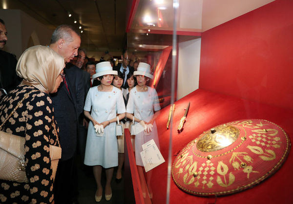 Eşi Emine Erdoğan ve Altes Prenses Akiko ile sergiyi gezen Recep Tayyip Erdoğan, sergideki eserler hakkında yetkililerden bilgi aldı.