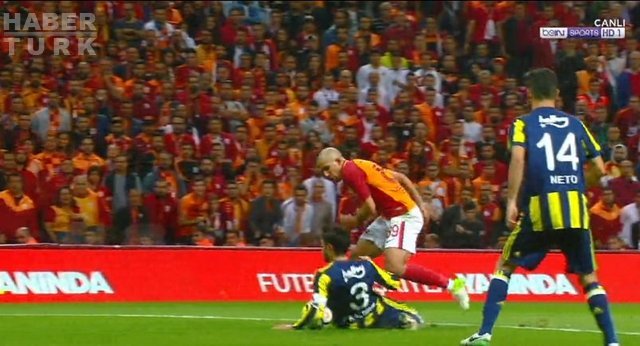 Denayer'in kafasından seken ve Neto'nun eline gelen top, ilk yarıda Serdar Aziz'in eline gelen topla aynı pozisyondu.