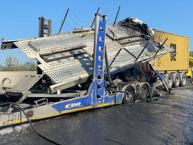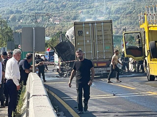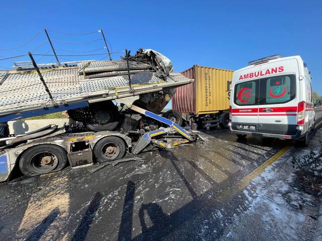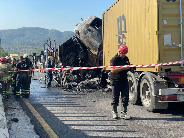 Kaza sonucu TIR'lardan birinde çıkan yangında sürücü hayatını kaybetti, araçlardaki 7 kişi yaralandı.