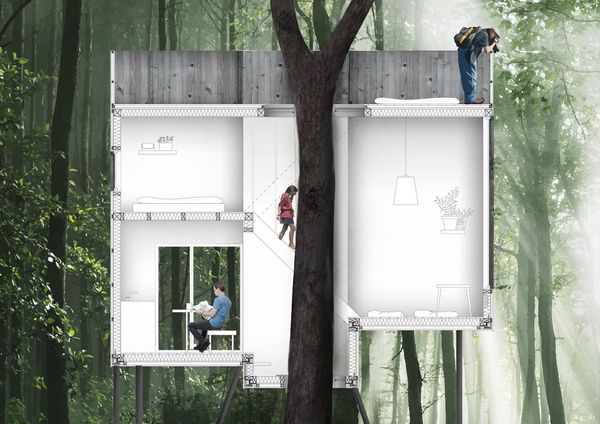 Løvtag firmasının, otel olarak tasarladığı küçük evde, 4 adet dinlenme yeri, mutfak, tuvalet, banyo ve çatı katı bulunuyor ve yerden 8 metre yükseklikte.