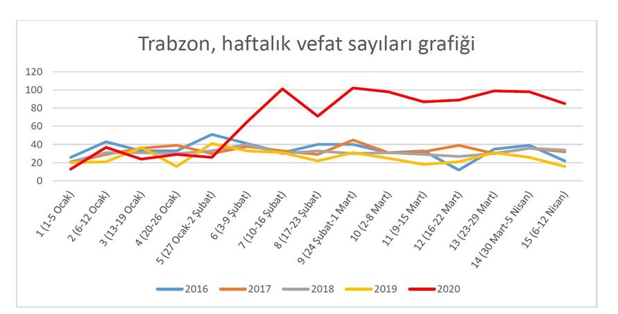 Benzer şekilde 2020 yılı Ocak ayının ilk haftası ile Şubat ayının son haftası arasında 2016-2019 yıllarına göre Trabzon ilinde de ölüm oranında istatistiksel olarak anlamlı düzeyde artış gözlendiğini kaydeden uzmanlar, defin istatistikleri incelendiğinde, 2020 yılının ilk 9 haftası için ölüm hızındaki haftalık artışın yüzde 25.3 oranında bulunduğunu kaydetti.