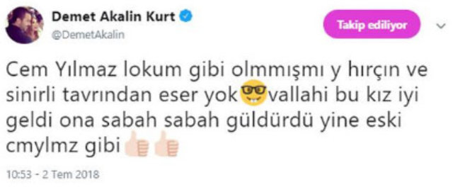 Akalın, Twitter hesabından, "Cem Yılmaz lokum gibi olmamış mı ya? Hırçın ve sinirli tavrından eser yok. Vallahi bu kız iyi geldi ona. Sabah sabah güldürdü yine eski Cem Yılmaz gibi" yorumunda bulundu.