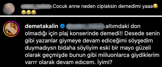 Tarzı yüzünden eleştiri yağmuruna tutulan Demet Akalın, bir takipçisinin; “Çocuk, anne neden çıplaksın demedi mi?” yorumuna kayıtsız kalmadı.