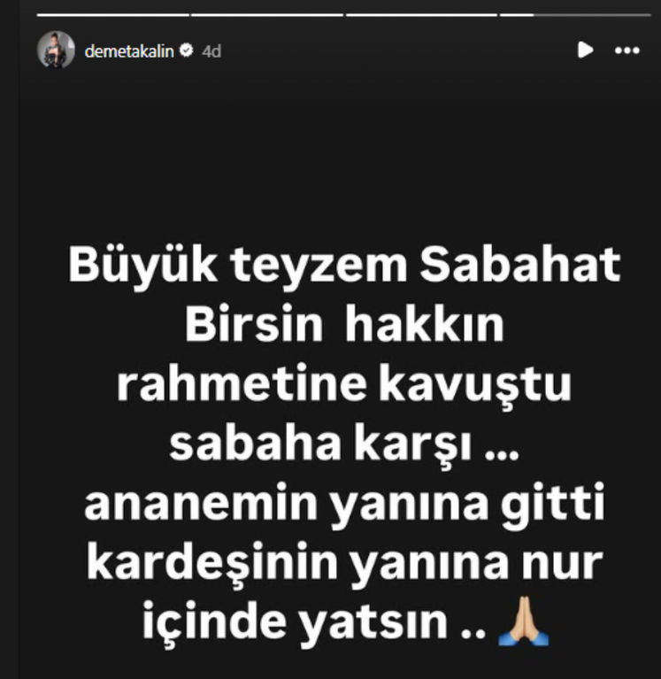 Demet Akalın; "Büyük teyzem Sabat Birsin, sabaha karşı hakkın rahmetine kavuştu. Anneannemin yanına gitti. Kardeşinin yanına nur içinde yatsın" ifadelerini kullandı.