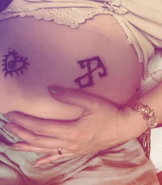 Anne olmak için gün sayan Demet Evgar, 'kalp’ ve ‘eli belinde’ motiflerini kınayla göbeğine çizdirmeyi de ihmal etmedi.