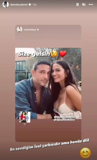 Öte yandan geçtiğimiz yıl nikah masasına oturan oyuncu Demet Özdemir ile şarkıcı Oğuzhan Koç ile ilgili bir iddia ortaya atılmıştı. Çelik Erişçi ve Ercan Saatçi ile yıllar sonra sahnelere dönen İzel Çelik, sosyal medya hesabından 'Bebek' isimli şarkı eşliğinde Demet Özdemir - Oğuzhan Koç çiftinin fotoğrafını yayınlamıştı. İzel, ayrıca fotoğrafa “Size gelsin...” notunu düşerek, kalp emojisi eklemişti.