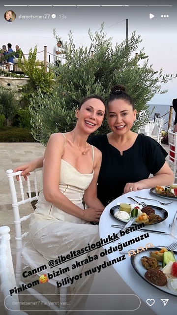 Demet Şener, ünlü oyuncuyla paylaştığı fotoğrafına; "Canım Sibel Taşçıoğlu, benim 'Pinkom'... Bizim akraba olduğumuzu biliyor muydunuz?" notunu düştü.
