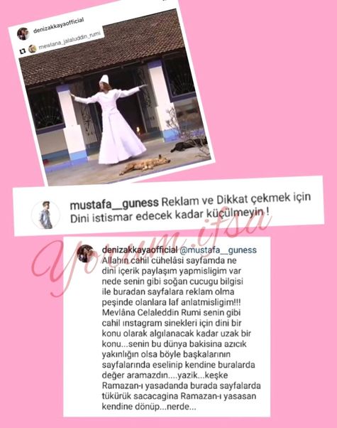 Paylaşımının altına "Reklam ve dikkat çekmek için dini istismar edecek kadar küçülmeyin" şeklinde yorum yapan takipçisine cevap veren Deniz Akkaya, "Mevlana Celaleddin Rumi, senin gibi cahil Instagram sinekleri için dini bir konu olarak algılanacak kadar uzak bir konu. Senin bu dünya bakışına azıcık yakınlığın olsa böyle başkalarının sayfalarında eşelenmezsin. Keşke burada tükürük saçacağına Ramazan'ı yaşasan" ifadelerini kullandı.