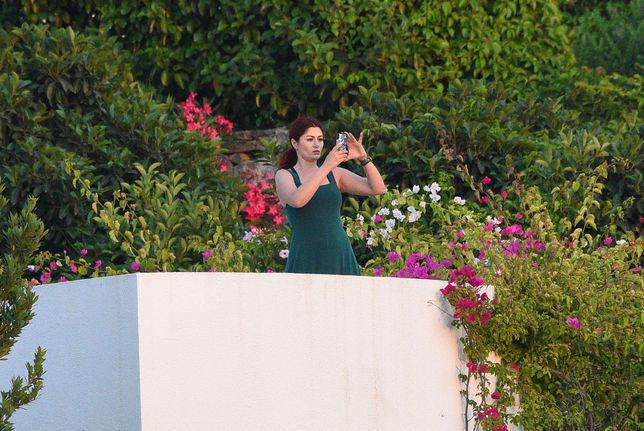 Oyuncu, kaldığı evin terasına çıkarak batan güneşi videoya alırken objektiflere yansıdı.